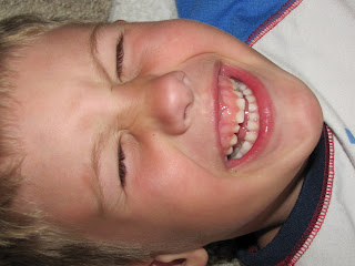 Playing with his buddy all day long and then realizing they were playing each other at t- ball tonight. Gabe thought it was "crazy" how they ended up on first base together. What are the odds when your friend is playing 1st base and you run there? Who would have thought...) 3. Gabe loves this giant dog. He dressed it in Spiderman boxers, a batman robe and wrestled it. Of course Gabe won every match by pinning the poor dog! 4. Gabe loves that Ben is home for the summer and they can do things like make a "second bed" in the living room and fall back asleep on a rainy morning. Finally, Gabe loved winning the game ball at tonight's t -ball game.